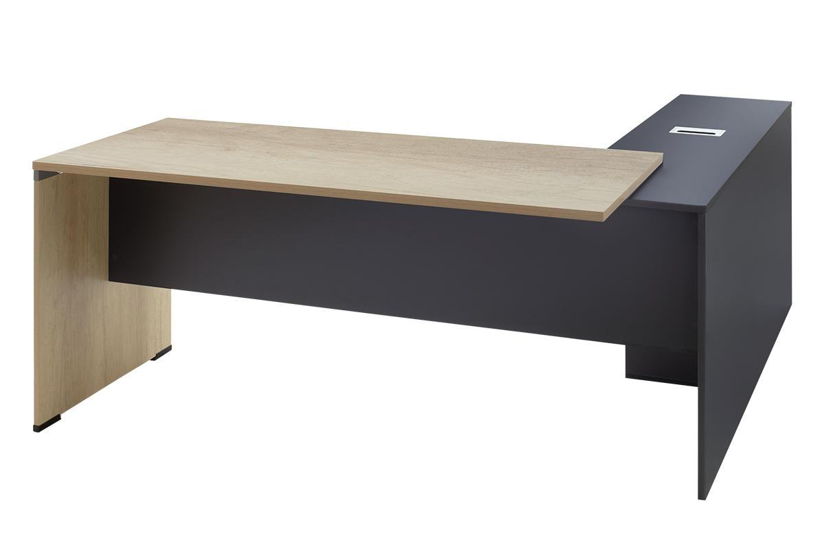Γραφείο διεύθυνσης με ενσωματωμένο γωνιακό αναστρέψιμο ερμάριο στον εντυπωσιακό χρωματισμό: φυσικό - ανθρακί. Κατασκευασμένο από υλικά υψηλών προδιαγραφών και σύμφωνα με τις εργονομικές απαιτήσεις του σήμερα.