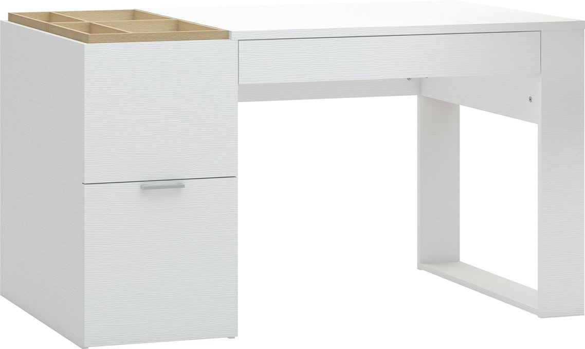 Γραφείο μοντέρνου σχεδιασμού σε λευκό χρώμα με λεπτομέρειες σε φυσικό  - 2 ευρύχωρα συρτάρια  - Ειδική θέση με χωρίσματα για τακτοποίηση αντικειμένων  - Ράφι στο πλάϊ του γραφείου  - Υψηλή ποιότητα κατασκευής